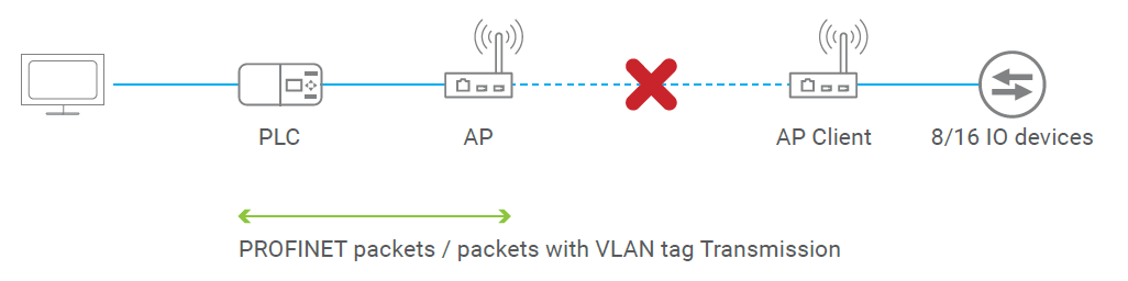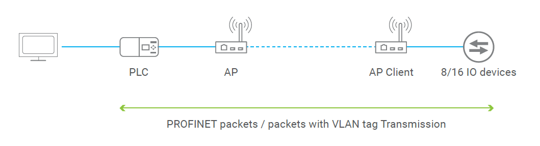 The AW5601-IC model includes a built-in Industrial Communication Mode, which combines advanced features such as Flash Roaming, PROFINET Transparent, and VLAN Tagging. Under this mode, packet transmission over wireless also differs from regular transmission. See the below diagram for details.