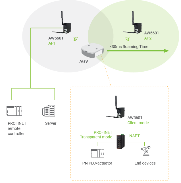 Many PLCs, however, work with PROFINET packets under a NAT/NAPT environment, which will be lost through address translation. Therefore, AW5601 supports a PROFINET Transparent mode to allow explicitly permitted PROFINET communications to pass through under a NAT/NAPT environment, achieving both efficiency and effectivity in AGV systems.