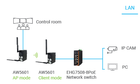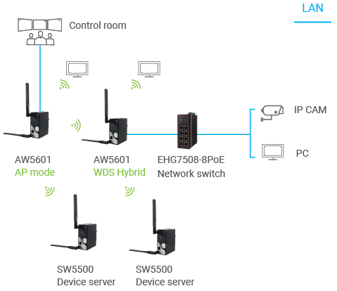 AW5601 is a rugged, industrial-grade wireless access point suited for harsh conditions. Utilizing the 5GHz frequency band, AW5601 causes minimal interference with existing wireless devices, allowing easy upscaling of systems. Besides basic AP/Client modes, an additional WDS Bridge mode allows distribution from a WDS Root to multiple WDS Hybrids and wireless devices. WDS Root and Hybrids have the same wireless MAC address, SSID, and wireless channel settings, forming a larger, more flexible wireless network than simple APs.