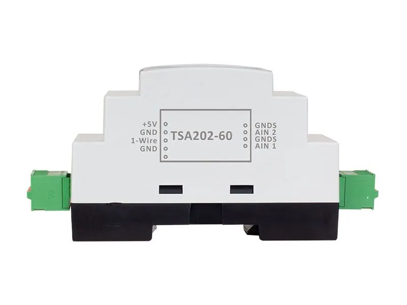 60V input module TSA202-60 is engineered for accurate high-voltage measurement in industrial and automation systems. It operates over the 1-Wire digital protocol, allowing easy integration into distributed sensor networks. Additionally, its analog inputs are galvanically isolated from the interface, which protects against ground loops and electrical noise while maintaining signal integrity.