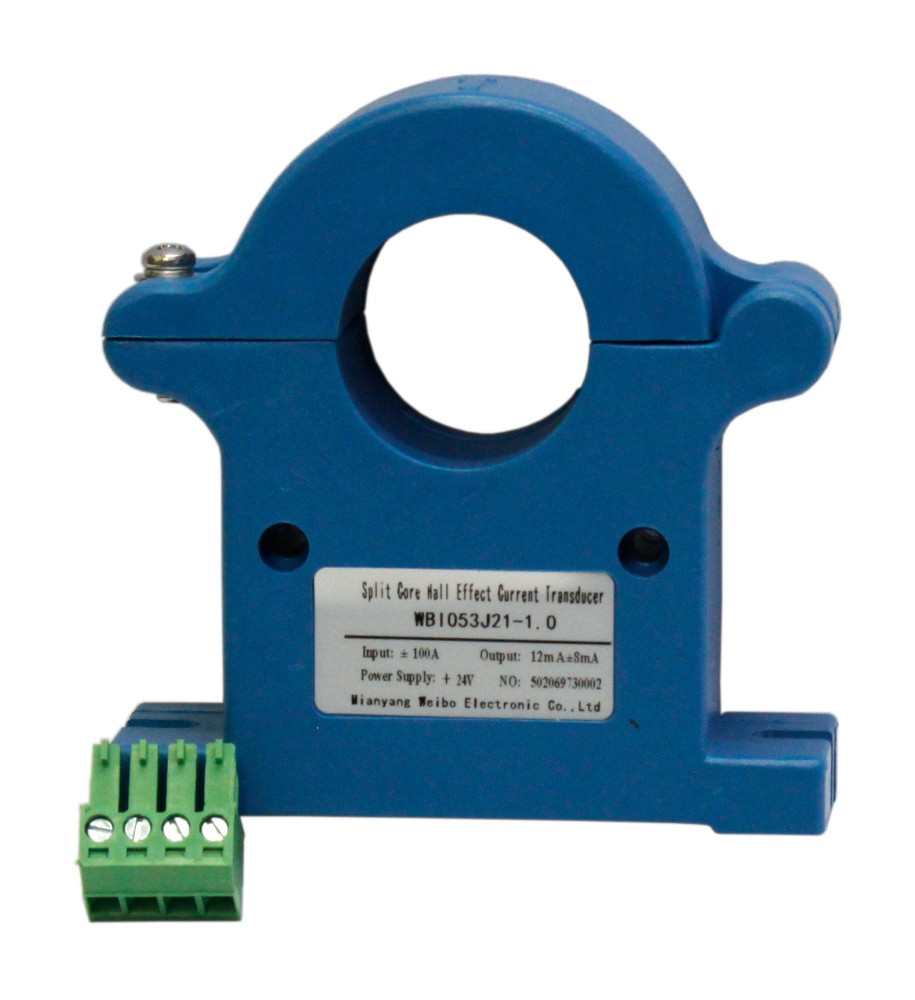 Split core hall effect current transducer presents a 4 to 20 mA DC signal representing the DC current flowing through a primary conductor. -100 to 100 A primary DC current range.