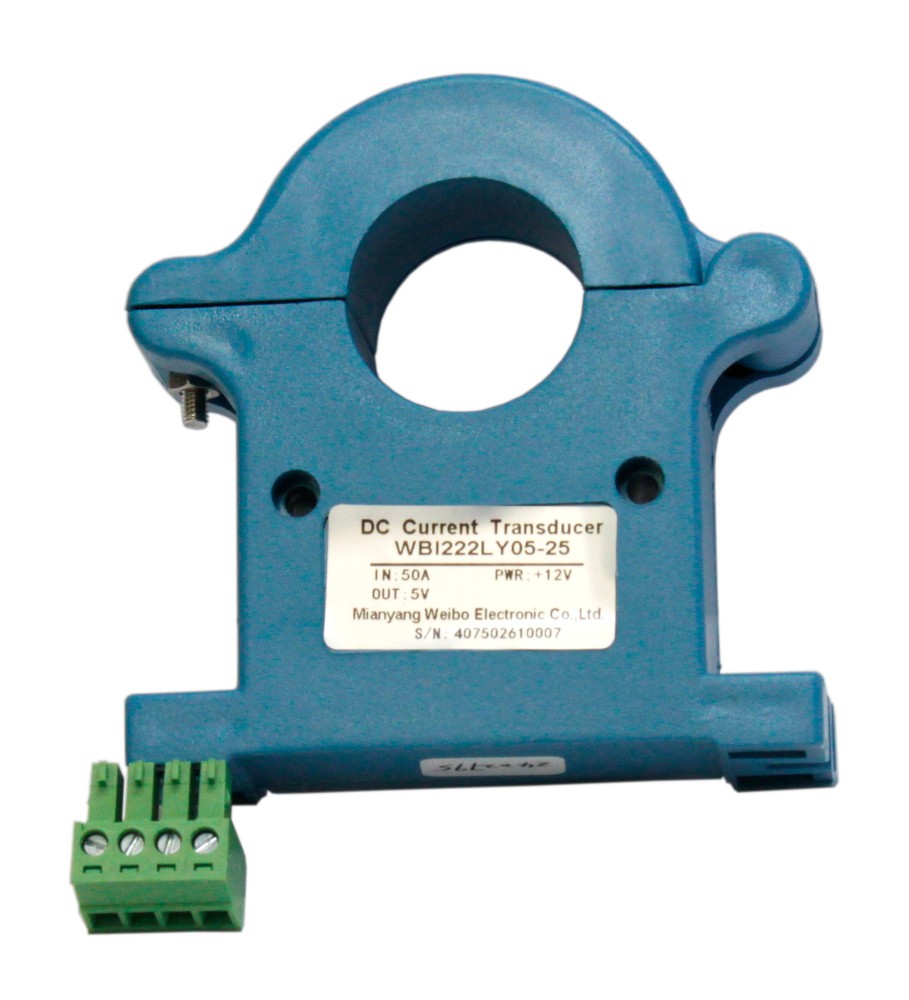 Split core hall effect current transducer presents a 0 to 5V DC signal representing the DC current flowing through a primary conductor. 0 to 50 A primary DC current range.